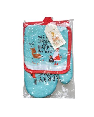 Set composto da guanto forno e presina; colori turchese e rosso con stampa a tema natalizio. Nuovo, in confezione originale. PREZZO NON TRATTABILE.