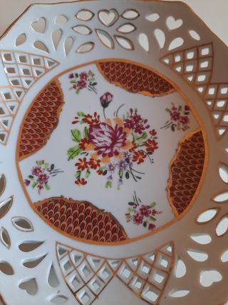 Centrotavola porcellana con decorazioni in smalto e oro.