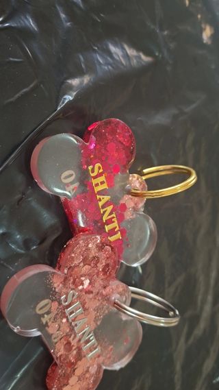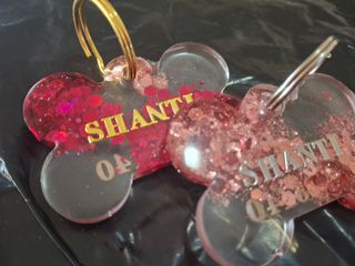 Bellissime medagliette personalizzate in resina per cani, a forma di osso. - Medaglietta rosa con glitter e nome (es. RUA). - Medaglietta trasparente con glitter blu e nome (es.RUFUS). - Anelli portachiavi a scelta tra dorato e argentato. - Possibilità di altri colori.