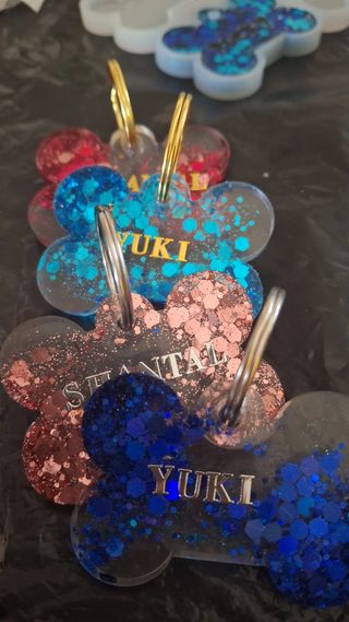 Bellissima medaglietta in resina fatta a mano, perfetta per il tuo amico a quattro zampe. Ogni medaglietta è unica e decorata con glitter scintillanti. - Decorata con glitter. - Nome personalizzabile (es. YUKI, SHANTAL). - Completa di anello portachiavi argentato o dorato. - Possibilità del numero telefonico sul retro.