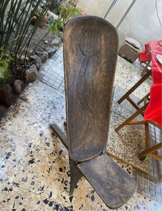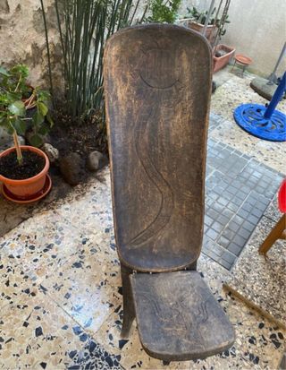 Sgabello alto tradizionale africano antico in legno realizzato a mano smontabile in due sezioni per essere facilmente riposto. Decorazioni con animali totemici sulla seduta, sullo schienale e sul retro. Come da fotografia. Misure schienale smontato 115 cm. X 39 cm. Ideale da mettere in giardino, sotto una pergola o arredare in angolo di casa vostra. SPEDIZIONE SOLO CON BRT CAUSA DIMENSIONI SGABELLO. NON SCEGLIETE INPOST