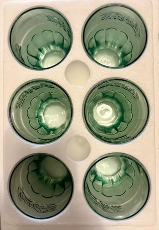 Set di 6 bicchieri Coca-Cola Originals risalenti agli anni 2000. Perfetti per collezionisti o per rivivere l'atmosfera di quel decennio. - Design iconico Coca-Cola. - Realizzati in vetro trasparente con sfumature verdi. Disponibili 2 set