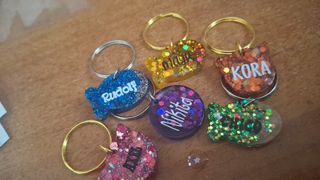 Medagliette personalizzate in resina, perfette per cani e gatti. Ogni medaglietta è unica e decorata con glitter e dettagli colorati. Mi trovi su instagram su @m.creations_handmade o su vinted su ang76vintela. - Medaglietta rosa con nome LUNA. - Medaglietta gialla con nome LEO. - Medaglietta a forma di osso trasparente e verde con scritte ROCKY e decorazioni verdi. - Medaglietta a forma di gatto verde con nome MICIO e glitter.