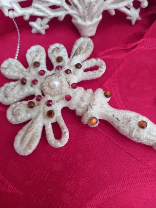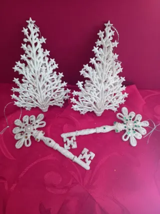 Set di decorazioni natalizie per l'albero o per la casa. - Due alberi bianchi glitterati con stelle. - Due chiavi decorative bianche glitterate, una con dettagli verdi.