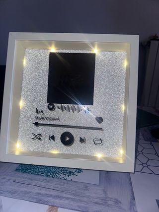 Cornice personalizzata con grafica Spotify, ideale come idea regalo. - Stampa personalizzabile con brano e artista. - Effetto glitterato sul retro. - Luci LED integrate.
