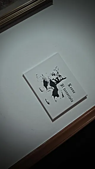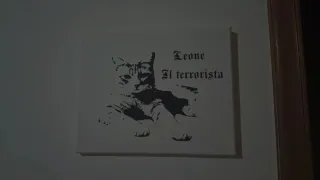 Tela personalizzata con un disegno stilizzato di un gatto realizzato attraversola foto. L'immagine presenta la scritta Leone Il terrorista in senso giocoso. Personalizza anche tu la tua foto preferita. - Stampa su tela. - Design unico. - Bianco e nero.