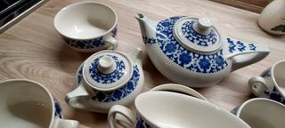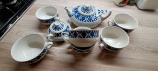 Elegante servizio da tavola in porcellana con decorazioni blu e bianche. - Teiera - Zuccheriera - 6 tazze