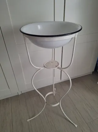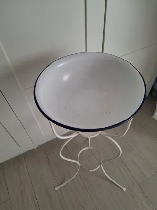 Elegante porta catino d'epoca, un pezzo unico per aggiungere un tocco di charme alla tua casa. - Struttura in ferro battuto. - Finitura bianca con bordo blu sul catino.