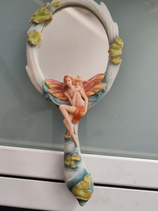 Bellissimo specchio da collezione o su un comò /comodino. Tenuto in armadio ma senza scatola ma è nuovo - Dimensioni: circa 22cm di altezza. - Motivo: fata con ali di farfalla. - Materiali: vetro e porcellana. - Colore: bianco e azzurro.