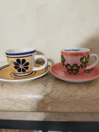 Delizioso set di due tazzine in ceramica, perfette per gustare un caffè. - Una tazzina presenta un design giallo con un fiore blu. - L'altra tazzina è rosa con decorazioni a quadrifoglio e una scritta Buongiorno Allegria!. - Entrambe sono accompagnate dai rispettivi piattini Una è uno sbeccata