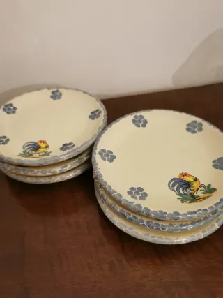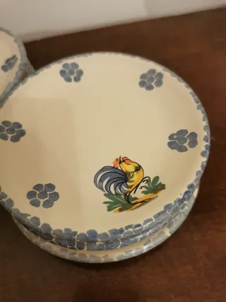 Set di 6 piattini in ceramica con decorazione a tema Puglia. - Ogni piattino presenta un gallo colorato. - Bordo decorato con motivi floreali blu.