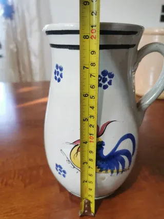 Brocca decorativa con un simpatico gallo dipinto a mano. Perfetta per aggiungere un tocco rustico alla tua tavola. - Motivo floreale blu. - Bordatura a righe nere.