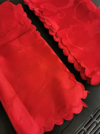 Eleganti tovaglioli in raso di colore rosso, perfetti per arricchire la tavola. - Bordo con motivo a onda. - Tessuto con lavorazione floreale in rilievo.