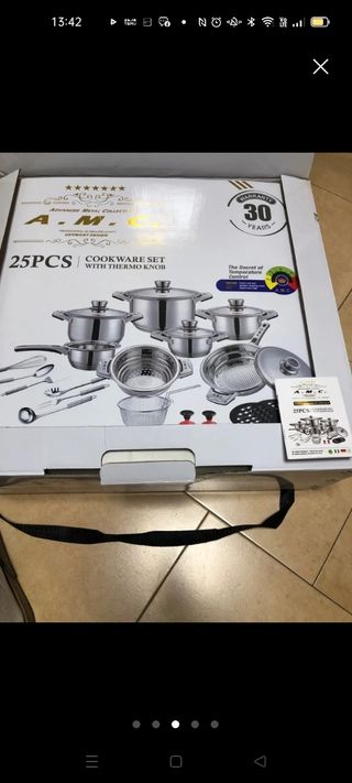 Batteria di Pentole AMC 25 Pezzi in Acciaio Inox, dotata di controllo della temperatura Materiale di Alta Qualità: Realizzate in acciaio inox. Dotate di un sistema di controllo della temperatura integrato per cucinare con precisione. Set Completo di 25 Pezzi: Include una vasta gamma di pentole, padelle, coperchi e accessori per coprire tutte le esigenze culinarie. Distribuzione Uniforme del Calore: Assicura cotture uniformi per piatti perfetti ogni volta. Facilità di Pulizia: Tutte le pentole sono lavabili in lavastoviglie, per una pulizia facile e senza stress. Adatte a tutti i tipi di piani cottura, inclusi quelli a induzione