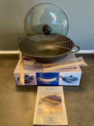 Vendo set da 5 pezzi ancora nella confezione originale, mai utilizzato. Marca Geist Kitchen Comprende: - wok in ghisa smaltata (diametro 36 cm, altezza 10 cm, larghezza compresi i manici 44 cm) - coperchio in vetro - griglia per tempura - bacchette (35 cm) e pinza per cucinare (24 cm) - ricettario Ottime condizioni. Scatola un po' scolorita, il ricettario ha una macchia. Misure confezione: 38x 38 h 10,5 cm Peso: 5,2 kg Disponibile per spedizione con Wallapop o ritiro a mano in zona viale Argonne (Milano).