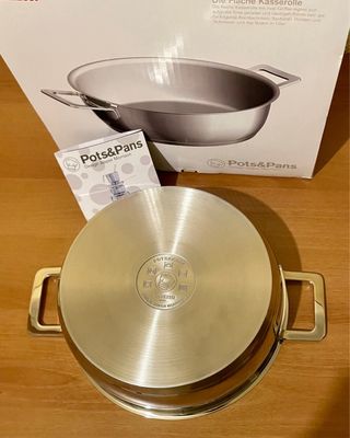 Pentola per cotture al forno, o su fornello a gas. La sua forma allungata consente la cottura, perfettamente in orizzontale, di arrosti, pesci, cotechini o zamponi. Marca Aeternum, Made in Italy, in acciaio Inox 18/10 certificato sul fondo, con coperchio sempre in acciaio. Peso pentola + coperchio: 1,8 kg Dimensioni in cm (Lungh/Largh/Prof): 30 (36 con manici) x 21 x 11 Facile da pulire, nessuna ammaccatura. Pentola e coperchio puliti ed in ordine, vendo per cambio cucina.