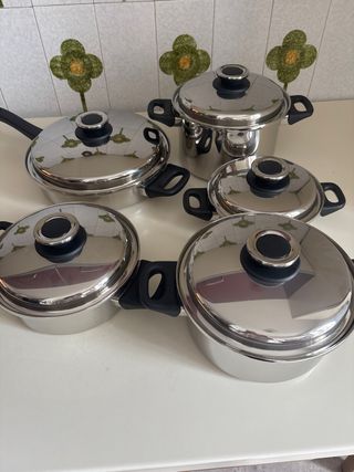 Bellissima batteria di pentole in acciaio inox 18/10, adatta anche per piani cottura a induzione. Il set include 10 pezzi, perfetti per tutte le vostre esigenze in cucina. Sono in ottime condizioni, brillanti e senza graffi. - 10 pezzi in totale - Acciaio inox 18/10 - Adatta a piani induzione