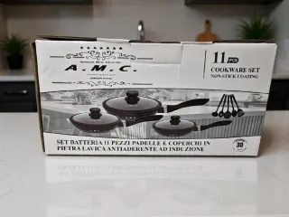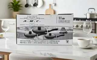 Tris di pentole batteria in pietra lavica antiaderente induzione Amc 11 pezzi Tris di pentole batteria in pietra lavica antiaderente induzione Amc 11 pezzi Questa batteria di pentole Amc da 11 pezzi, realizzata in pietra lavica con rivestimento antiaderente, garantisce una cottura uniforme e di alta qualità su piani a induzione. Il materiale resistente assicura durata e facilità di pulizia, mentre il design ergonomico offre praticità in cucina. Ideale per chi cerca performance professionali e affidabilità in un set completo. Incluso nella confezione: 20cm padella 1,1L con coperchio 24cm padella 1,5L con coperchio 28cm padella 2