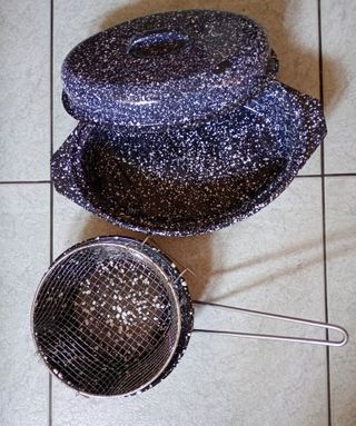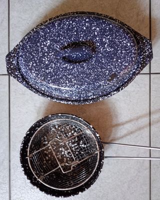 Set composto da tegame con coperchio e friggitrice con cestello, entrambi con finitura smaltata. Friggitrice diametro cm 20 e altezza cm 8, usata solo una volta; tegame lunghezza cm 30 più i manici e altezza cm 16, mai usata, smalto leggermente sbeccato ma senza ammaccature; peso totale kg 1,850 - Design a macchie blu e bianche. - Tegame ovale con manici. - Cestello con griglia interna e manico.