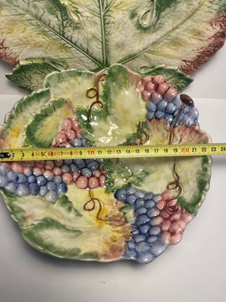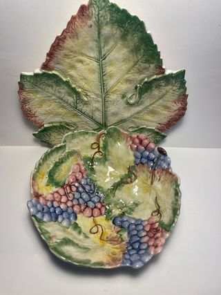 Elegante fruttiera vintage in ceramica Maiolica, a forma di foglia con grappoli d'uva. - Design a forma di foglia. - Decorazione con grappoli d'uva. - Composta da 2 pezzi. Firmata GV.