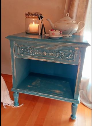 Elegante comodino in legno con finitura decapata che dona un tocco vintage. Perfetto per aggiungere stile alla tua camera da letto. - Design con un cassetto e un vano a giorno. - Dettagli decorativi intagliati sul cassetto. - Gambe tornite per un look classico.