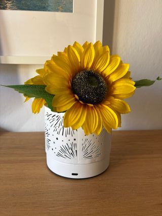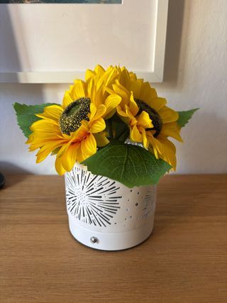 Lampada da tavolo con luci LED, girasoli di seta e base in metallo. - Funziona senza fili ed ha una batteria ricaricabile mediante porta USB-C. - Controllo touch sulla base della lampada che permette di accendere, spegnere o cambiare l'intensità della luce - Luce LED non abbagliante con 3 modalità di colore: caldo, naturale e bianco. Il tipo di luce è selezionabile sempre tramite il controllo touch. Perfetta per la tavola, la camera da letto o il soggiorno. Usata poco, intatta e perfettamente funzionante in tutte le sue componenti, senza difetti estetici. Scrivimi pure per altre info!