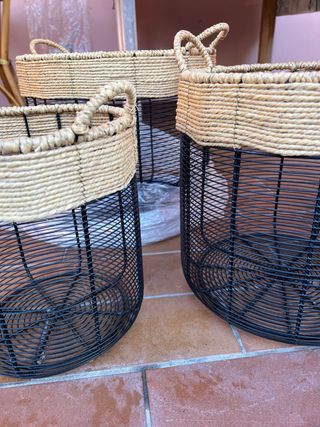 Elegante set di ceste in metallo con finiture in bambù. - Design moderno e funzionale. - Ideali per organizzare e decorare. - Materiali resistenti e durevoli.