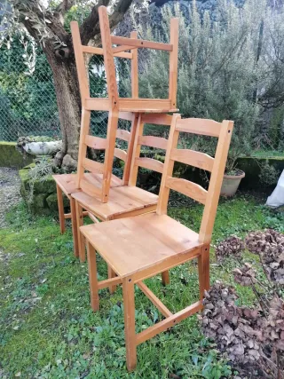 Set di quattro sedie in legno, leggere e facili da spostare. Ideali per completare l'arredo della casa o del giardino. - Struttura in legno chiaro. - Design semplice e funzionale. CONSEGNA A MANO A PADOVA.