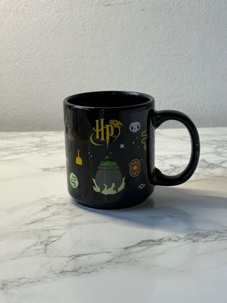 Tazza in ceramica nera con un design ispirato al mondo di Harry Potter. Presenta vari simboli iconici del franchise. - Tazza con stampa a tema Harry Potter. - Realizzata in ceramica resistente. - Colore nero con dettagli dorati e colorati.