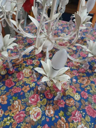 Elegante lampadario con una struttura in metallo bianco e dettagli in vetro. - Design floreale con foglie. - Decorato con pendenti in cristallo. - Lampadine a forma di goccia.
