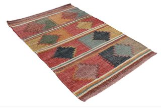 500602-1 Tappeto Kilim con un design geometrico e frange decorative. Le sue dimensioni sono 170x120 cm. - Motivo a rombi e strisce. - Bordi rifiniti con nappe. - Tessuto resistente.