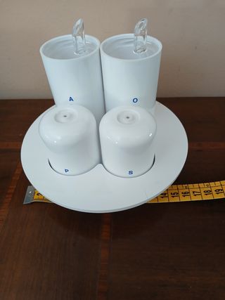 Elegante set per condimenti della linea Pomona di Guzzini.Designer Ambrogio Pozzi.Made in Italy anni 80. - Design moderno e funzionale. - Materiali di alta qualità. - Ideale per sale e pepe o altri condimenti.