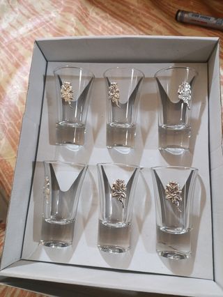 Elegante set di sei bicchieri da liquore, perfetti per ogni occasione. Ogni bicchiere è impreziosito da una borchia a forma di rosa in metallo. - Sei bicchieri inclusi nel set. - Design con borchia a rosa in metallo.
