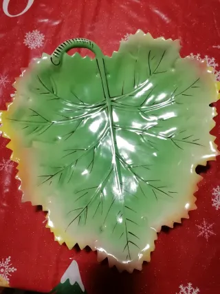 Elegante piatto centrotavola a forma di foglia, perfetto per aggiungere un tocco decorativo alla tua tavola. - Design a forma di foglia con dettagli venati. - Bordi frastagliati e un piccolo manico decorativo. - Tonalità verdi con sfumature gialle sui bordi. Un pezzo è stato riparato. Spedizione rapida 😍