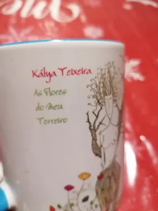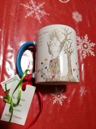 Tazza in ceramica con un'illustrazione artistica di una figura femminile tra alberi e fiori. - Design unico con dettagli floreali. - Manico di colore blu. Fatta in Brasile. Spedizione rapida 😍