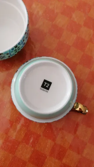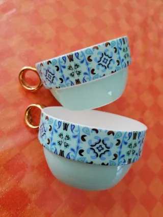 Elegante set di due tazze in porcellana con un bellissimo motivo decorativo. - Design con dettagli turchesi e oro. - Manici dorati a contrasto. Condizioni come da foto. Spedizione rapida 😍