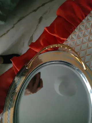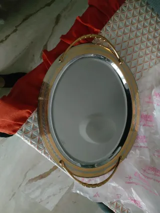 Elegante vassoio ovale, perfetto per servire con stile. - Realizzato in acciaio inossidabile. - Bordi decorati con finiture dorate. - Manici dorati per una presa comoda.