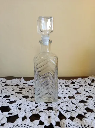 Bottiglia/decanter per liquori o whisky in vetro con un motivo a spina di pesce (chevron) e un tappo in vetro. È realizzato in vetro trasparente, permettendo di vedere il contenuto. Ha una forma quadrata o rettangolare e include un tappo in vetro che aiuta a preservare l'aroma e il sapore dei liquori.