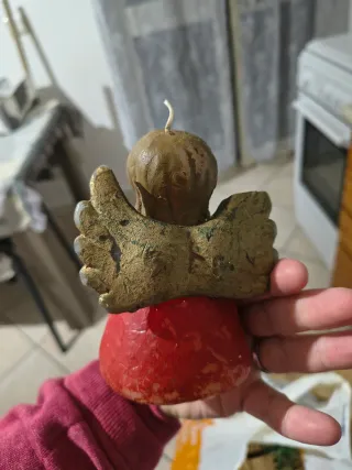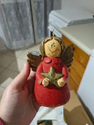 Candela a forma di angelo con una stella. - Dettagli dorati sulle ali e sulla stella. - Vestito rosso. - Viso sorridente.