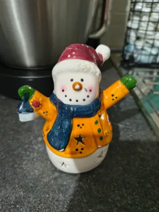 Grazioso porta candele a forma di pupazzo di neve, perfetto per creare un'atmosfera natalizia. - Design festivo con cappello rosso e sciarpa blu. - Dettagli dipinti a mano, come occhi, bocca e guance rosse. - Indossa una giacca arancione decorata con pois verdi e stelle intagliate. - Tiene una lanterna blu in una mano.