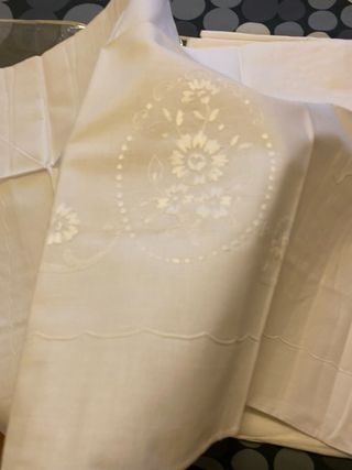 Elegante tovaglia con ricami floreali e dettagli in pizzo grande cm 160 x 235 Completa di 12 tovaglioli coordinati cm 40x40 Esce dal baule da rinfrescare aloni di conservazione - Motivo floreale centrale con rose e fiore grande. - Fascia decorativa in pizzo traforato. - Ricami tono su tono. - Bordi rifiniti con cura.