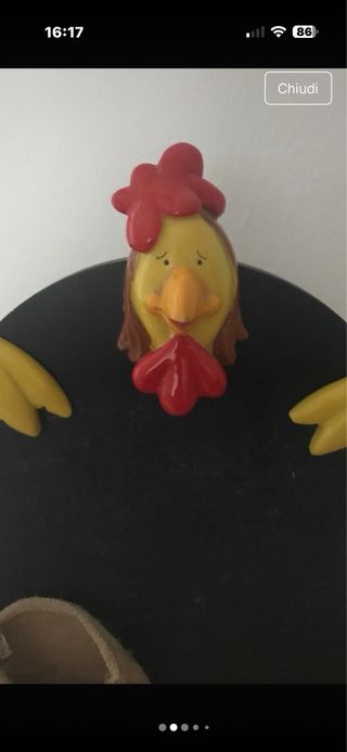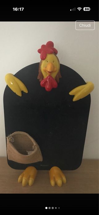 Lavagna decorativa a forma di gallina, perfetta per la cucina o per appunti. - Design originale Brandani. - Struttura in lavagna nera. - Dettagli colorati in rilievo. - Tasca in juta applicata.