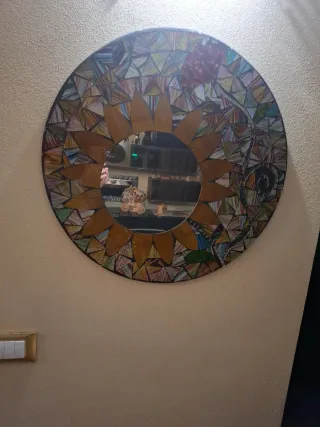 Bellissimo specchio da parete con una cornice decorata a mosaico. - Cornice con dettagli colorati. - Forma rotonda.