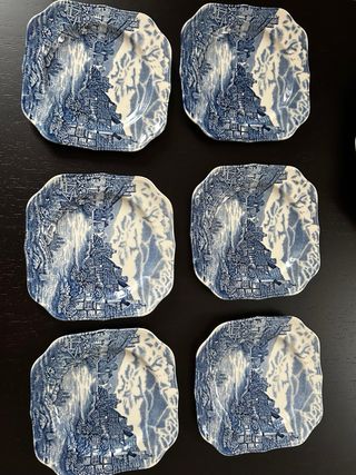 Elegante servizio da dolce Olde English Countryside by Johnson Bros, made in England composto da 6 piattini da dolce dimensioni 15,5x15,5 cm e un piatto da portata dimensioni 24,5x 24,5 cm. Colore bianco e blu. In perfette condizioni, come nuovo.