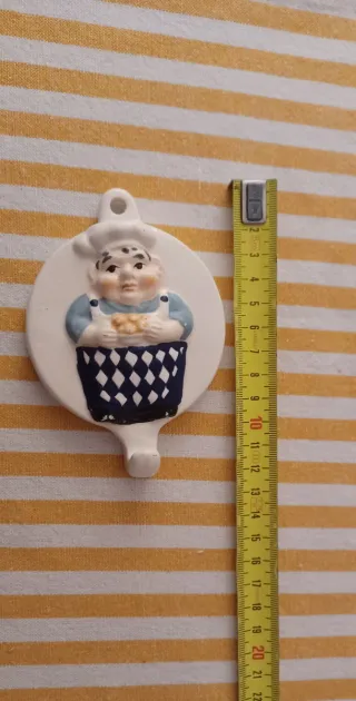 Appendino per strofinaccio con soggetto cuoco,in rilievo. Ceramica. Mai usato. Si può appendere con adesivo o attaccare con la calamita, rimuovere l'adesivo. Adatto alla propria cucina o per un locale ,anche come originale regalo. Misure e dettagli in foto, guardarle tutte.