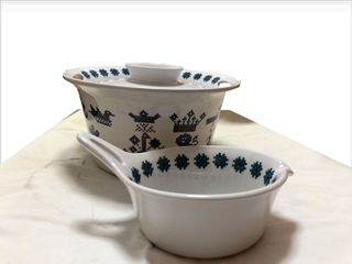 Set 2 Pentole casseruole in porcellana da fuoco Vintage Figgjo Flint Menu Casseruola Grande con coperchio: Altezza cm. 14 Diametro cm. 23 Casseruola piccola Altezza cm. 5,5 Diametro cm. 13 design di Hermann Bongard, , Made in Norvegia, Mid Century Modern 1960