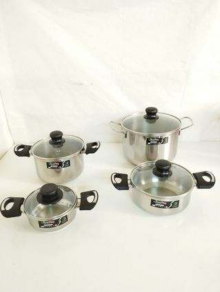 set di 2 pentole e 2 Casseruole in acciaio inox made in Italy, complete dei rispettivi coperchi in vetro temperato. Misure: 1 pentola cm 18 1 pentola cm 22 1 Casseruola cm 14 1 Casseruola cm 18 4 Coperchi in vetro temperato totale 8 pezzi