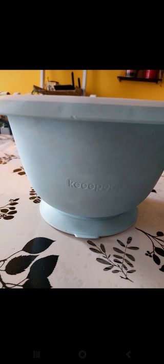 in silicone azzurro e bianco con fondo a ventosa per tenere ferma la bacinella