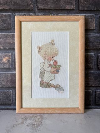 Quadro con cornice in legno e vetro. Misura 24x34x1,5 cm. Ricamo su tela da schema Gloria & Pat "Precious Moments" Ottimo stato.