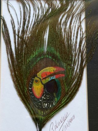 Piume reali dipinte a mano e autografate. In cornice di legno e vetro protettivo. Misura: 15x20 cm